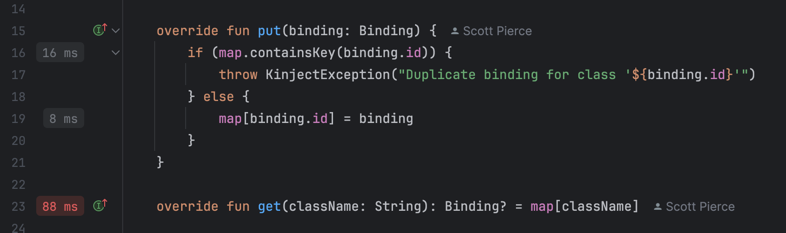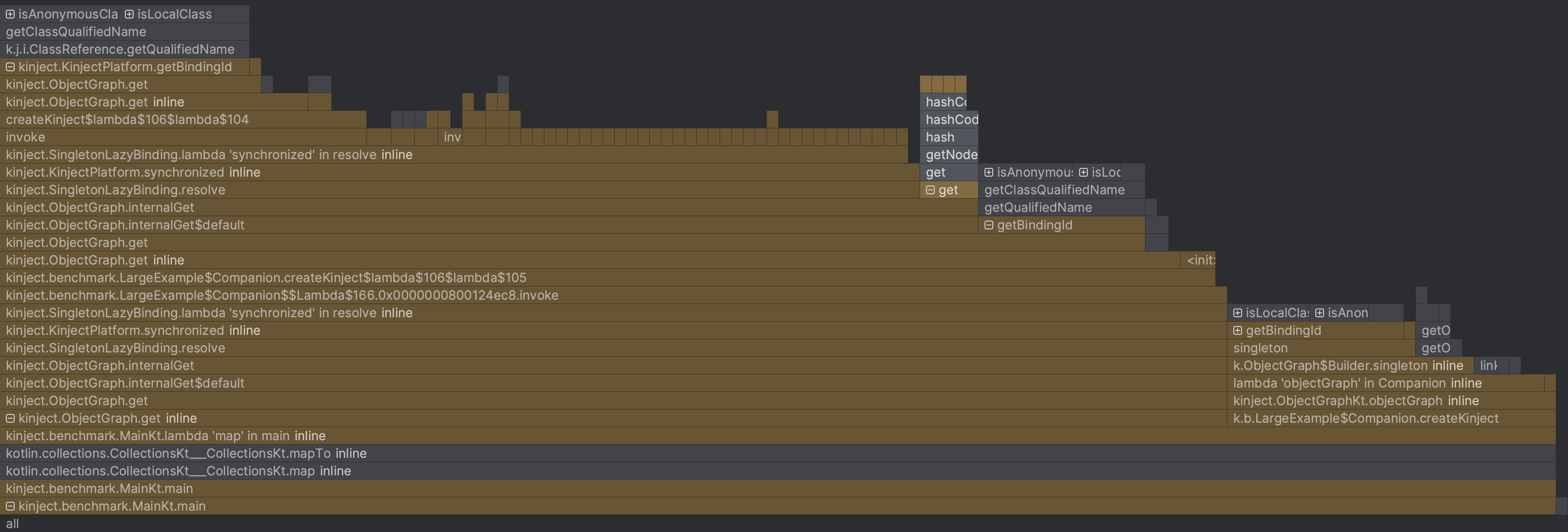 KinjectPlatform.bindingIdare accounted for, it’s taking 53% of the total execution time. This is a surprise and warrants an investigation. HashMapBindingTable.getaccounts for only 3.74% andHashMapBindingTable.putaccounts for only 0.74%. I get similar results when profiling on a modern Android Device. This is another surprise. On Dalvik and early versions of ART, theBindingTablebased on aHashMapwas a performance bottleneck. Since then, ART has added JIT compilation as well as several memory allocation improvements. When I first made Kinject, I was able to get a ~40% improvement in performance with a custom hashing algorithm; however, it seems very unlikely that I’ll be able to see the same performance improvements by focusing any efforts here, but I’ll investigate this anyway, since it was my original plan for the blog post.